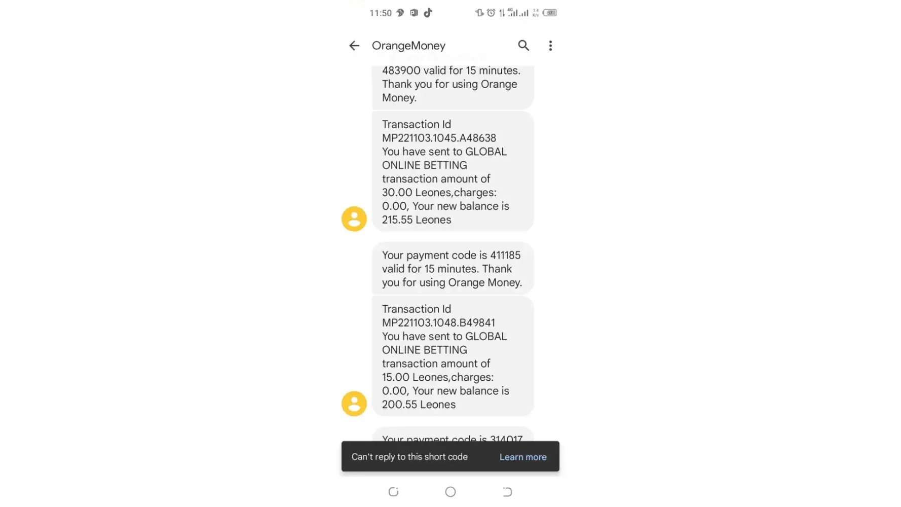 On the 28th of October 2022, I won Le 150. But I only received Le 55 via orange money. Below are details of the transactions;