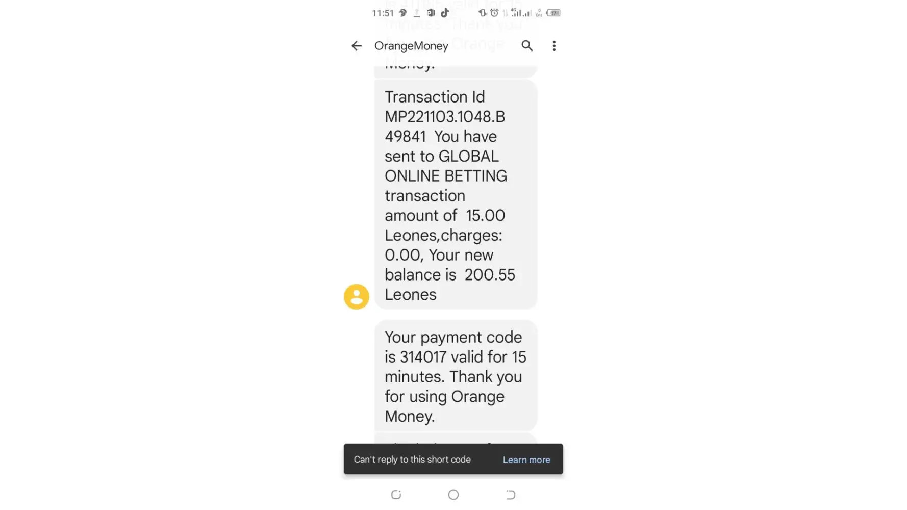 2.Transaction Id MP221103.1048.B49841 You have sent to GLOBAL ONLINE BETTING transaction amount of 15.00 Leones, charges 0.00, Your new balance is 200.55 Leones