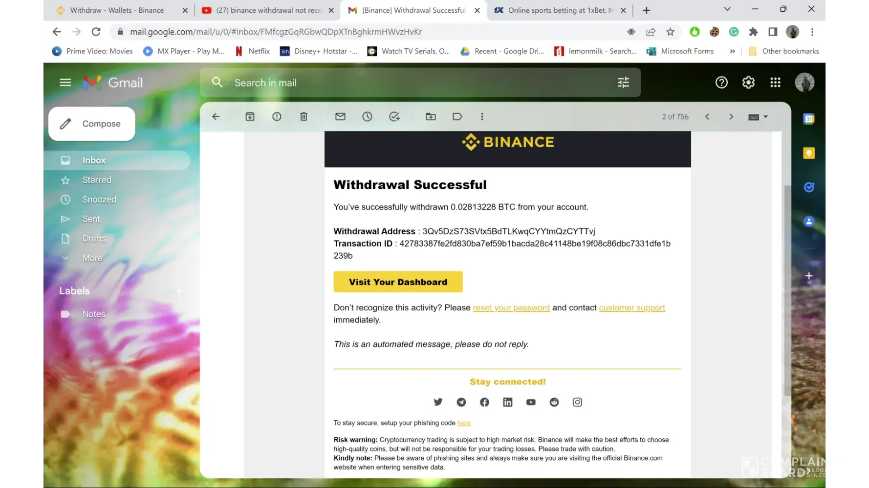 I deposited 0.02833228BTC though Binance to my 1xB.et account on [protected]:46. I called and even emailed then about the problem and they just made me wait everyday by telling me my problem is being looked after and today they told me that they can't do anything because the deposit hasn't reached in their wallet and I have done some kind of mistake or something. I had deposited before this as well and this problem never occurred with me. This was the first time that I deposited this big amount and they claimed that they did not receive the payment. Please help me receive my payment or atleast refund it by any means.