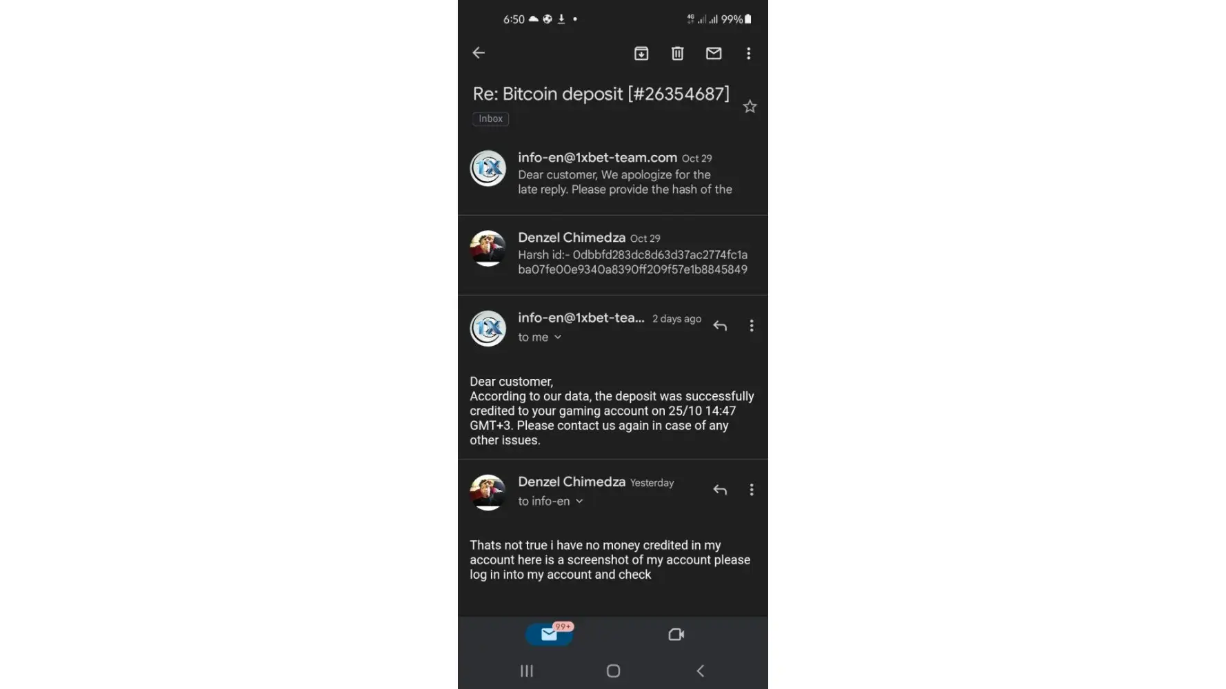My account number is [protected]. I made a deposit using bitcoin dated 25-10-2022 at 1.14pm. It was a deposit of 0.005197 which was equavalent to $100usd. I sent it from wallet id 3BhqSZhToLeT5UMPT9yeWEzcjSvEx9Ko5b and i sent it to wallet id 32a9597jHCMASMRnsrrXwXG7MKcSE7XeCg which was provided by the app. After 24 hours i sent an email to [protected]@1xbet-team.com and I got a response after a week and some days and they said that they had credit money to my gaming account but there is nothing in my account. They dont respond to queries and when they do it is so not helpful and you have to wait for the next response that will come after weeks.
