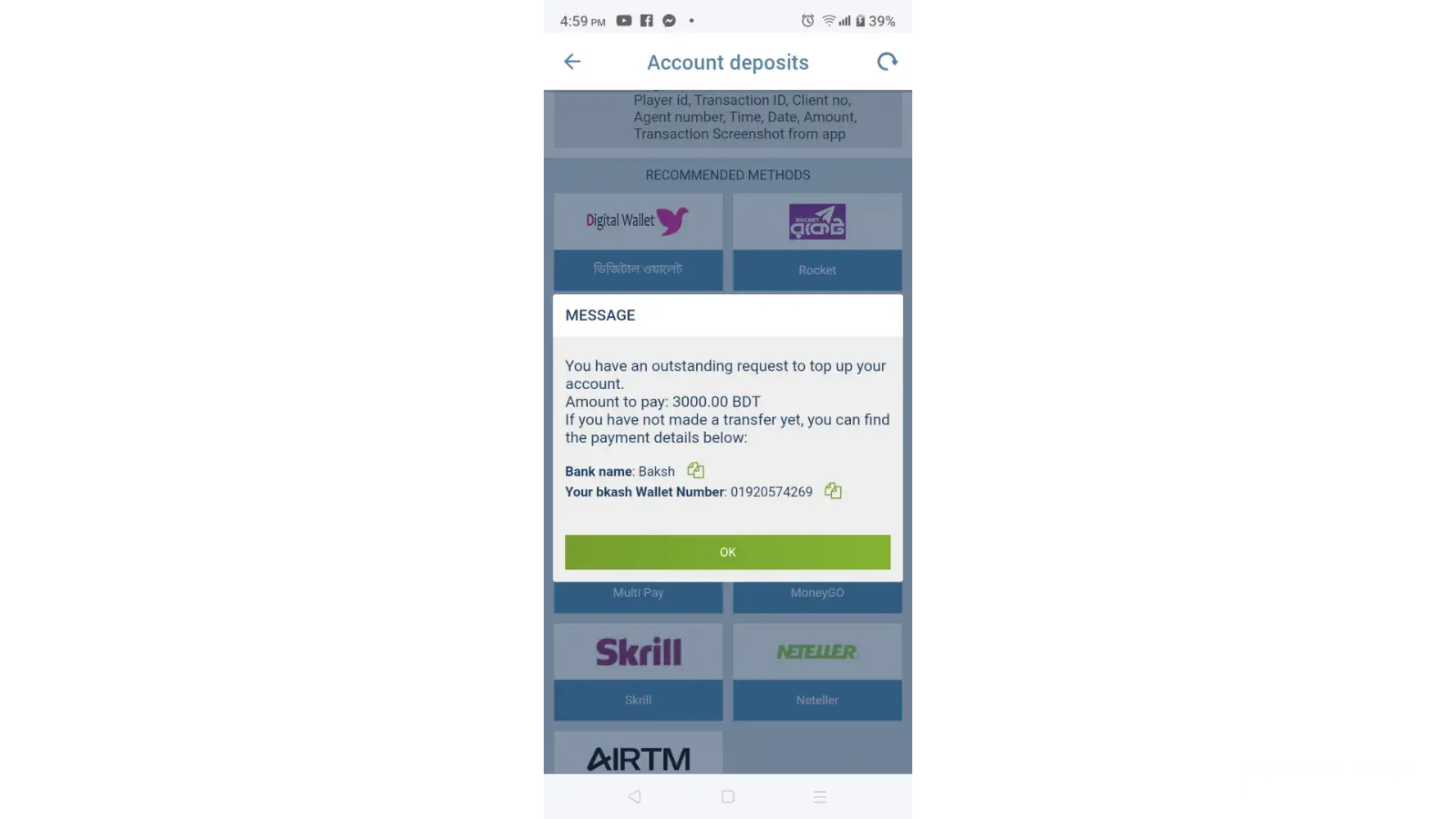 money deducted from my account but no deposited