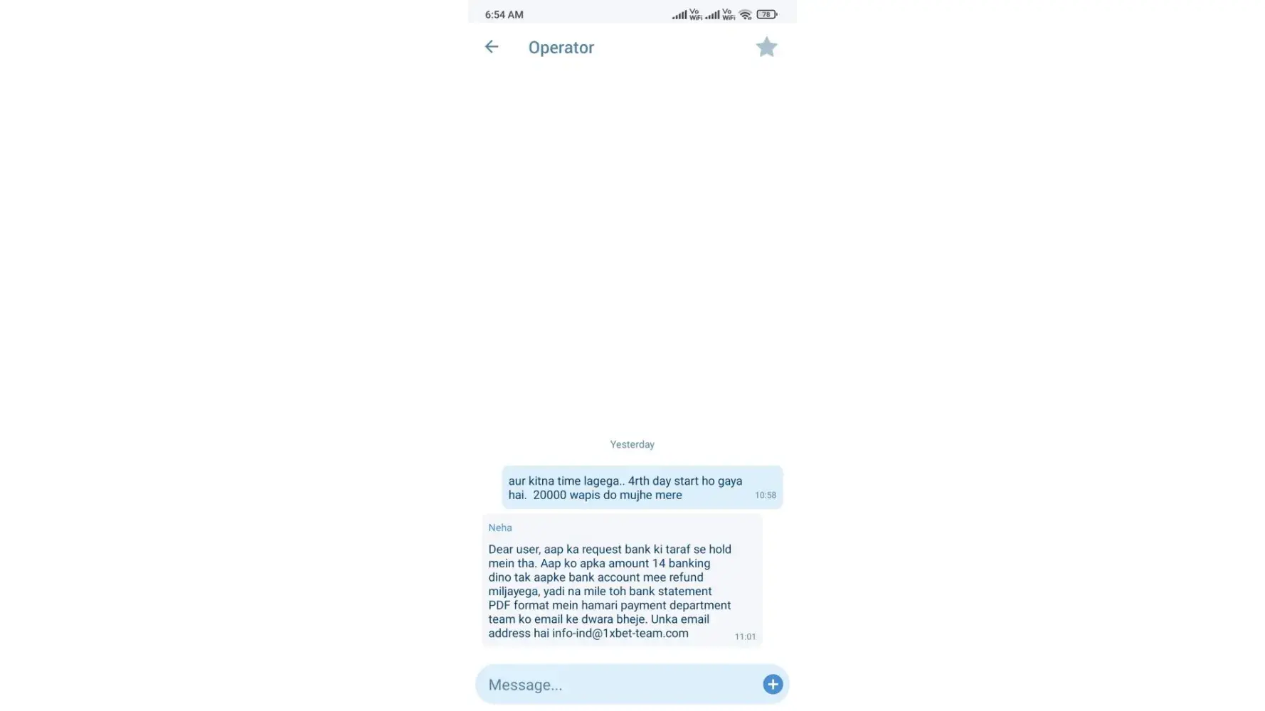 I have deposited INR 20000 on 6 August at 1:35 pm. I received successfull msg. But payment of 20000 didn't credited in my wallet. I emailed 1xbet they said me send us screenshots of payment. I sent them. Then they said you payment hold by bank. Within 14 days you will get. After 14 days I again didn't get anything from 1xbet. I emailed them but they are not replying me.. I sent multiple emails and asking why you are not refund my money. They are not replying me.. I am so fed up. Please see the attachments of payment which I deposited.. please resolve my issue.