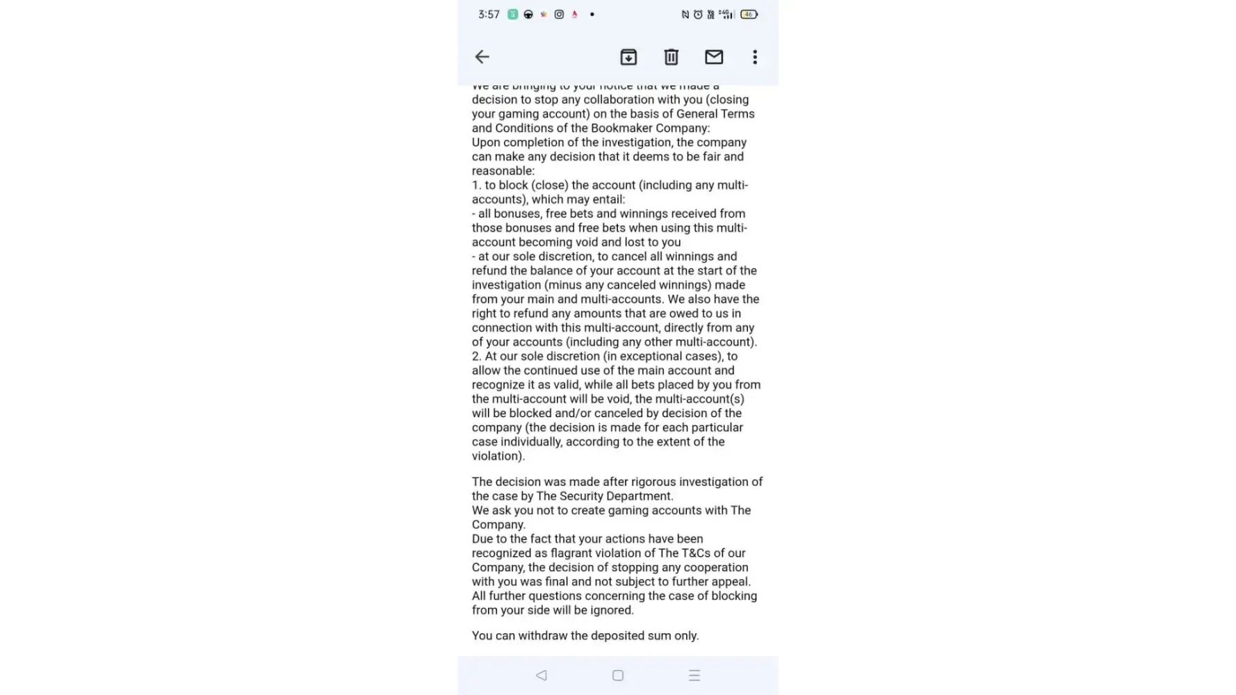 I made a last deposited of 4000$ in my 1xbet account to play an odd of less than 1.3 As soon as I requested for withdrawal they denied me telling me that I had to send some documents to the security department for verification this was more than 2 weeks ago. I kept sending the documents they asked for to a point that they requested for my BVN(Bank Verification Number) I had to sent it because my money was as stake