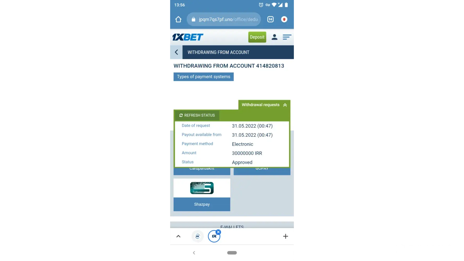 I made a deposit of Rs 350 on 21 June 2022, 10:18 AM. Its been 10 hours still my money has not been credited to the 1xbet account.