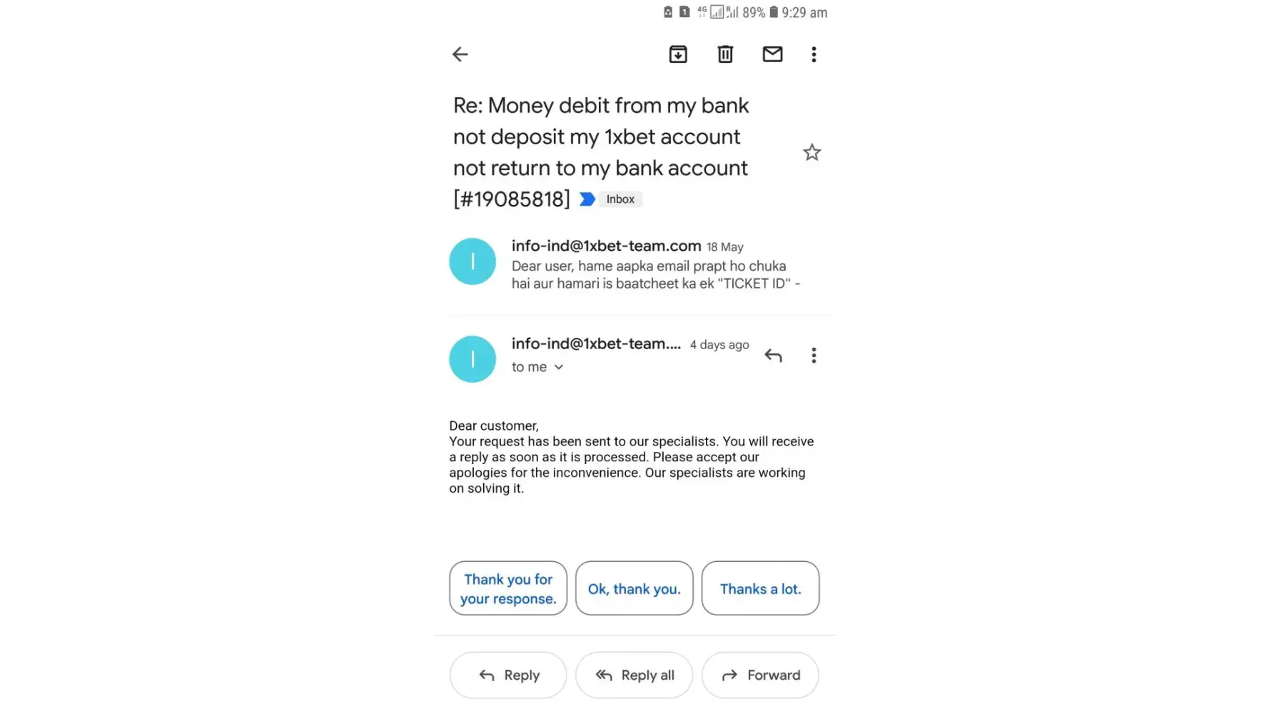 i deposited 4000 INR nearly 10 days ago the money got deducted from my account bt it was not credited in my 1xbet account .