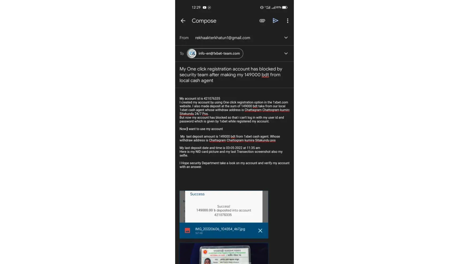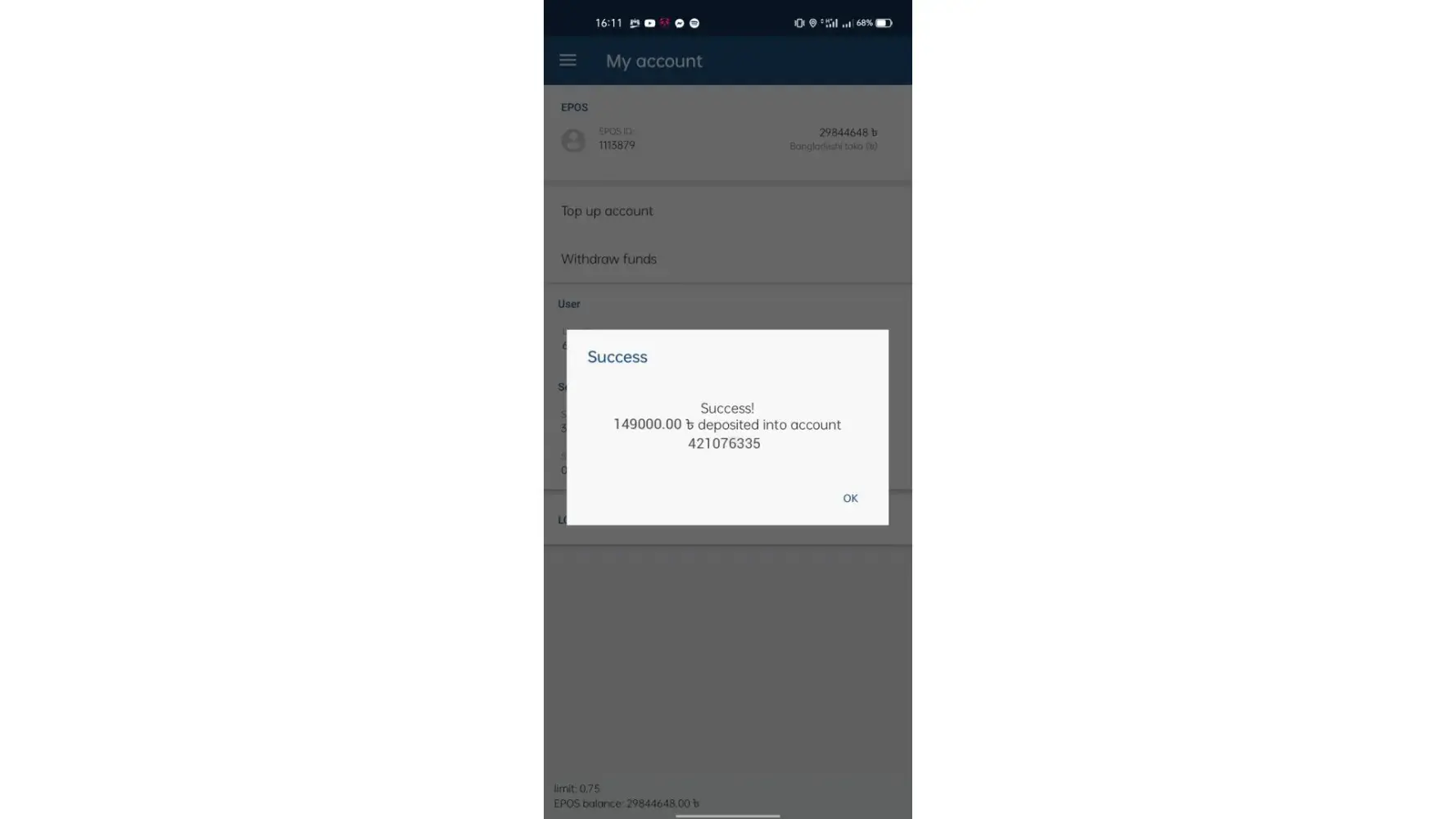 After that I made deposit into my account. Deposited amount was 149000 bdt from a 1xcash agent whose EPOS address is Chattagram Chattogram Sitakundu kumira 24/7 pos.