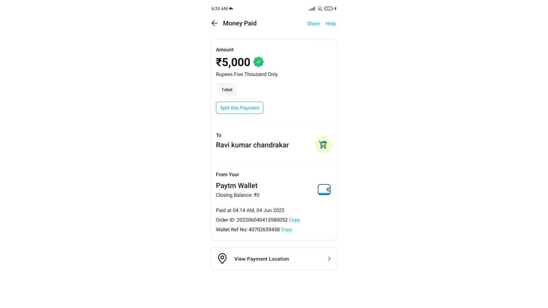 The payment was done on 4th June at 4.14 am of 5000₹ which is still not credited, have even informed the chat team, Whatsapp group & even sent the email, but still no help from their end, payment was done through paytym, below is the proof of payment.
