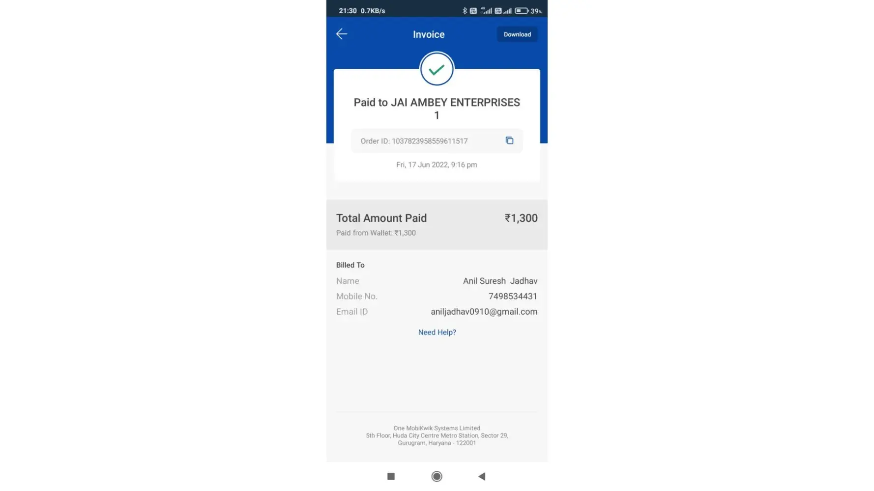 I deposited 1300 inr through mobikwik wallet on 17 june 2022 but till money not credited to my account . Operator rejected my deposit but money got debited from my bank .