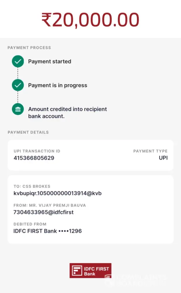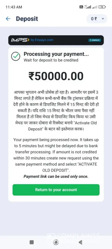 I did a payment of INR 50000 on 03.05.2024 but after some time I got a notification saying Deposit rejected in the amount of INR 50000 via epayment (Rejected) I tried to connect customer care by using the online chat and calling facilities, but every time when I call them ended up with giving fake promises saying that the problem will resolve within one...