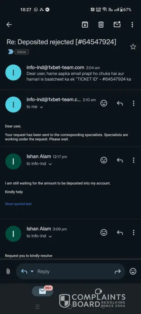 I deposited 5000 inr, in my 1xbet account on 21st june 2024 but no amount was credited to my account. I checked with the 1xbet support team by submitting all relevant documents but till today no reply from the team.