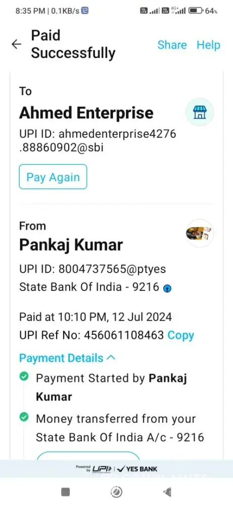 Sir maine ahmad enterprises [protected]@sbi ke account me ₹1800 diposit kiya lekin amount aaj tak account mein credit nahi hua hai please check kare maine utr nom. Daal kar request daali fir bi nahi sussex full hua please check kare maine paytm ke dwara payment diposit kiya date 12 july 24 time 10.10. Pm utr. Nom.[protected] please check kare sabkuch theek hone baad bi amount nahi aata account me