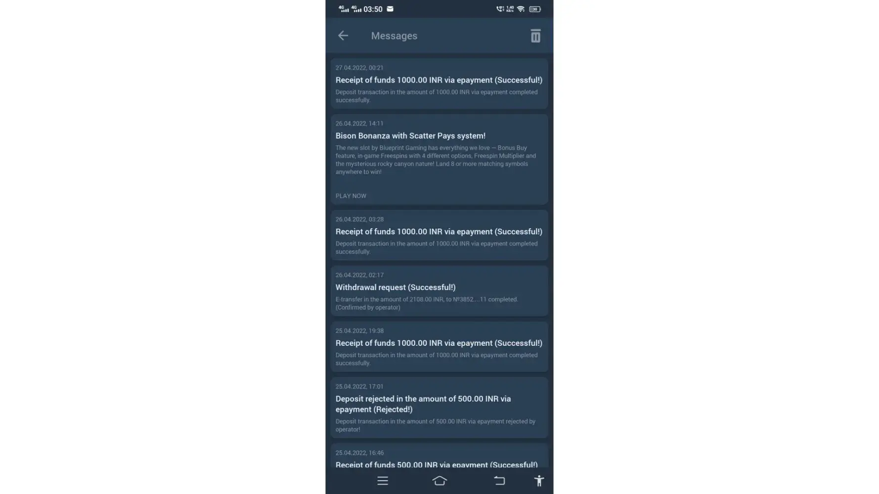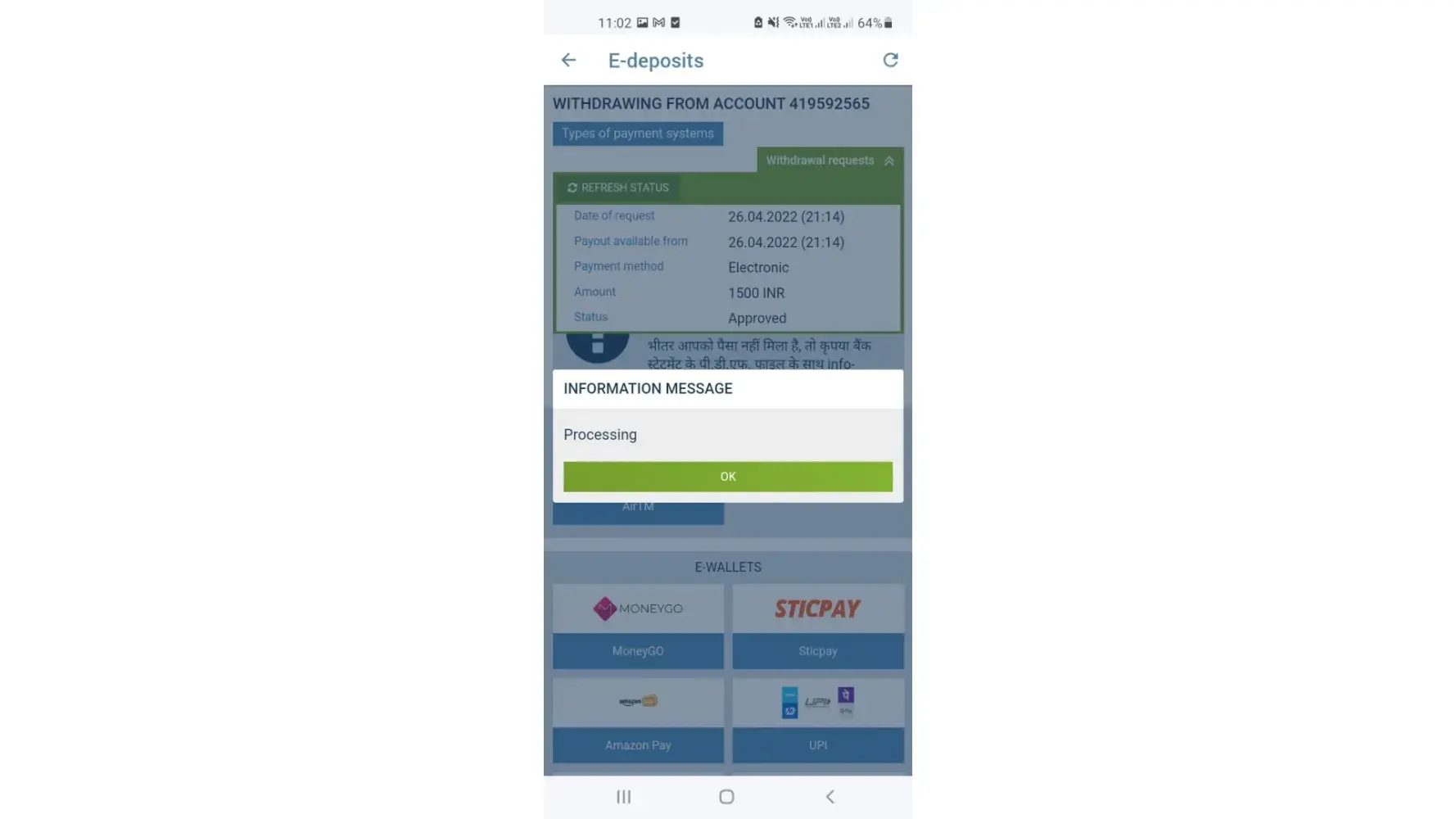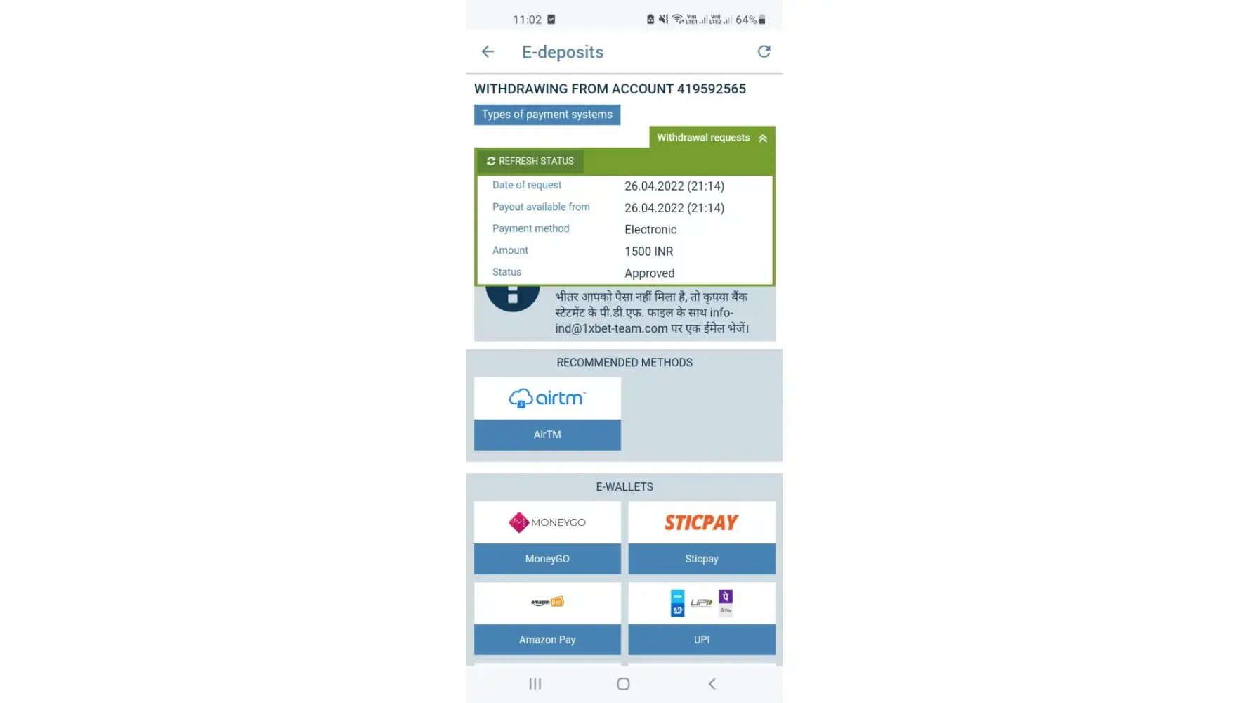 I had withdrawn amount of rupees 1500 from 1xbet account to my bank account. Amount was immediately deducted from my 1xbet account however it is not credited to my bank account.