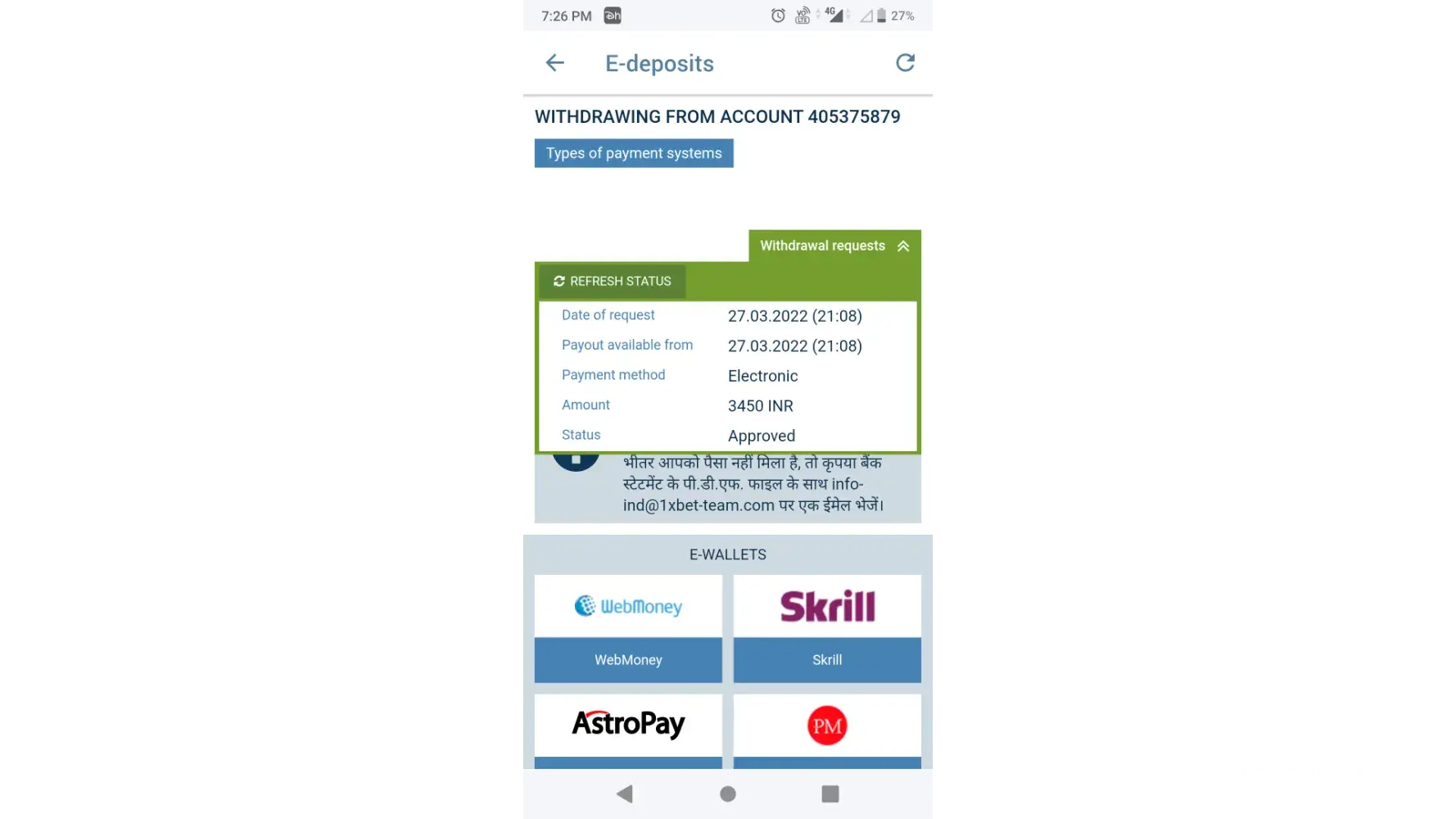 Yesterday about 7.30 pm I deposited amount of 100+1900-total 2000 rupees.In patym wallet of which 1xbet ask me to deposit. After 11.30 I win 3450 then I requested for withdrawal. They approved my withdrawal but I didn't yet get my money I have so shortage of money that's why I take risk and their customers support did not answered.