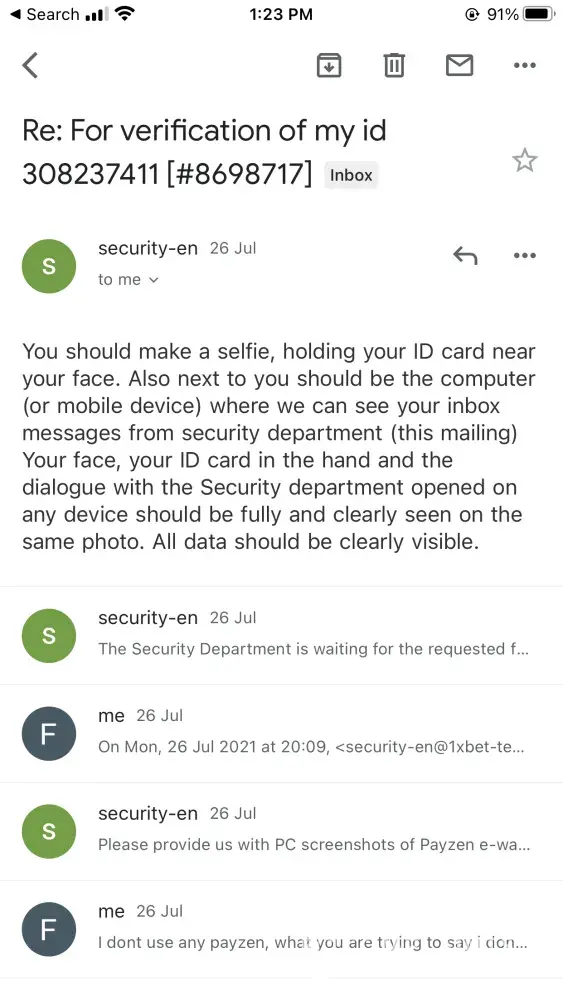 My id number in 1xbet is [protected] when i have deposited money continuesly for 1 week they didnt askd me for any verification n now whn i try to withdraw amount they are asking me to send id which i have sended it thn asked me to take selfie along with id i have done it then askd me to give a screenshot of pc which i have done n then they are saying not like this do it like that thn done it then sayng no do it like this n oll fed up submitting documents now they are not responding
