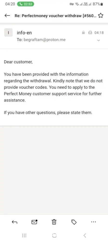I'm Bettor from iran, through 15 years of my betting journey never experienced something shady happend this week on 1xbet. I used to deposit/cashout using perfectmoney there. Lately cuz of pm restrictions for iranian users site support suggested me to use pm vouchers. The way vouchers work is with 2 identifier. 1. Voucher number, 2. Activation number Basicly owner is the one who has these 2 identifier of voucher. This week I requested 15$ as a voucher (funny considering the amount I deposited there) Request approved and I received completed msg in app, But never got anysort of voucher code in my mail. Funny part begins from here. When I open support section gives me persian operator that I dont need, I totally prefer english support for problems that im getting They asked me to sent documents to resend the voucher (they never realy send though) How legal it is? It is not, Cuz they are not responsible party and not even reliable to have personal documents, they are just section to handle payments with iranian banks. (that im certaily not part of) im using international banking systems for the job. [protected]@1xbet-team.com When I contacted 1xbet officiall This guys are from another planet it seems, they reapeatedly saying ur payment is done, this is batch number. totally unrelated answers they provide. Go ask perfectmoney why we didnt give u you voucher details, I will put emails screenshots and their funny answers.