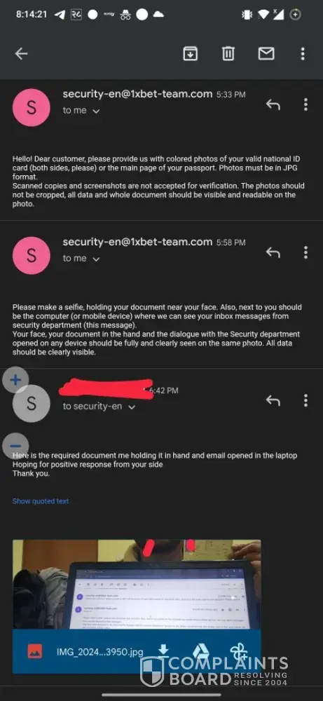I am writing to express my profound dissatisfaction and concern regarding my account (ID: [protected]) with 1xBet. After successfully verifying my account for the first time, I was unexpectedly asked to undergo the verification process once again following my recent winnings.