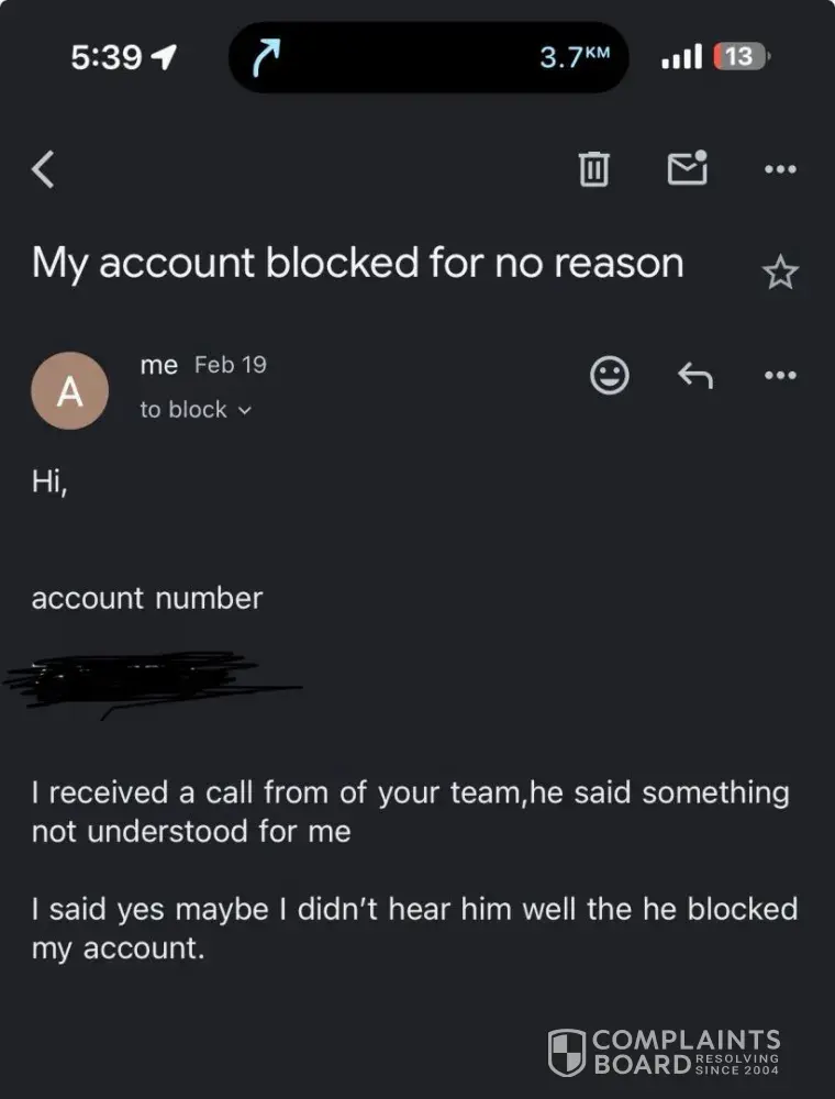 Three weeks ago, I received a call from a member of your team. Unfortunately, the conversation was unclear, and the representative was rude, not allowing me the chance to understand or address the issue before abruptly ending the call. I believe there might have been a misunderstanding during the conversation, as I received a vague threat of blocking my account.