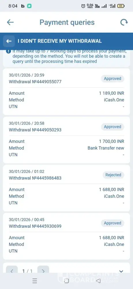 Here I have attached the bank statement from 29th January 2026 to 1st Feb 2026 as well as screenshot of complaint raised on 1xbet site.