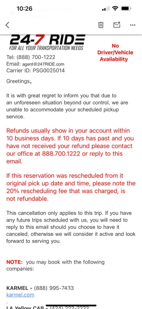 24/7canceled both are drop off and pick up via email a few hours before the scheduled pick up time. However, going on their website I could rebook at this as soon as they canceled. If there are no available drivers then why are they allowing me to book the same ride for the same time same airport same pick up? I have requested refunds. I received an email stating that I would receive an email 24 to 48 hours ghat time frame has long since expired. They've taken my hundred dollars no services rendered and I want the money back. He refused to help me and are very rude.