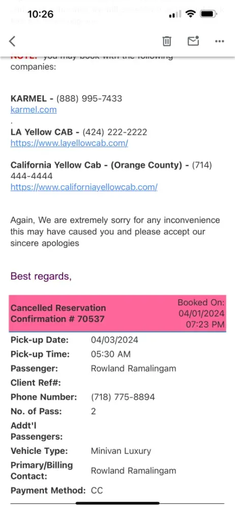 Cancelled pick up and drop off to LAX after confirmation issued. Also in the cancelation e mail, nothing noted about refund of payment.