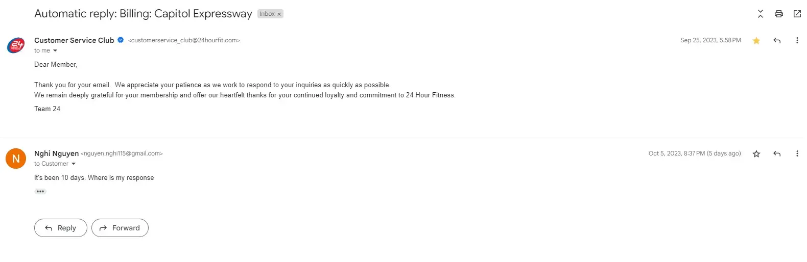 I want to file a complaint to 24-hour fitness customer service as they fail to resolve any of my issues. I reached out to their phone center, only to be redirected to 24hr at where I go, which is the one in Aborn Rd, 95122. I called them multiple times and no one picked up during working hours.