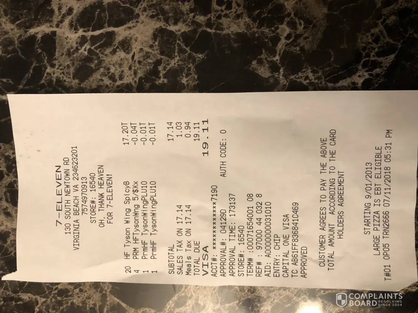 7-eleven has advertised 10 wings for $7.49, but this is the sixth time my order has rung up inaccurate and the worst attitude from the cashier. I brought it to her attention that she didn't ring up the transaction correctly, but she didn't care and turned away. They should be able to add before cashiering and have some kind of friendly customer service. I'm tired of paying extra and dealing with unfriendly cashiers.
