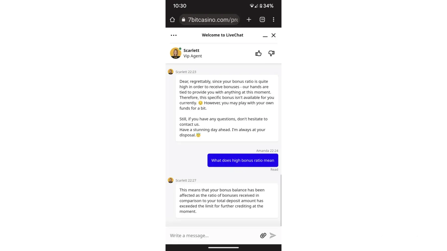 When I asked what this means the agent said my bonus balance has been affected as the ratio of bonuses received compared to my total deposit amount has exceeded the limit for further crediting at the moment.