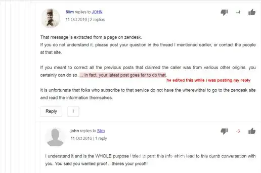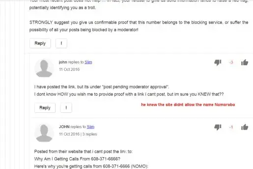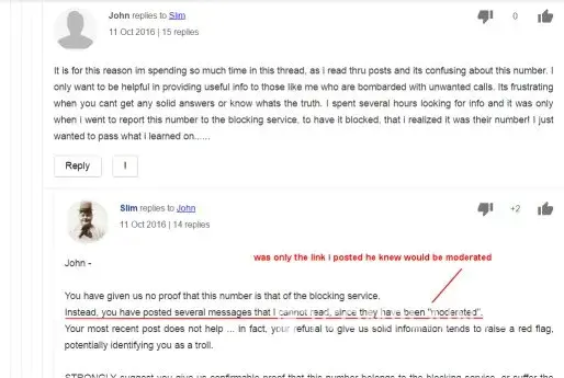 I made a post about a number that i had information of, more than just that they called, but my post went right into moderation. I attempted several times to post it, but then asked what happened and could a moderator explain. A registered user answered my questions just fine and i was ready to move on. A second registered user then started asking questions, even though he could see i had been helped, i even said that i had been helped. He continued asking questions towards the validity of what i had posted, or wanted to post but couldnt due to the site blocks the name Nomorobo. My post was specifically about that blocking service since it was their number i was posting about. He baited me by asking me to post an external link to prove the number was specific to that service as i claimed. I tried, but it went automatically in moderation and he knew it would. He then badgered me saying if i cant prove it i must be a troll and then edited his post once he realized i was right and i replied before i seen it. He then removed my posts saying that i was being nasty and not helpful.