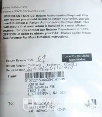 On Jan. 22, 2011 I ordered the Pro version of the Abcoaster. On Jan. 23, 2011 I was hospitalized, in ICU, due to a heart attack. I was unable to call in time to cancel my order. The abcoaster was delivered on Jan 28, two days after I returned home from the hospital. I called Abcoaster to arrange for return of the unopened box and was given a Return Authorization Number. I was also asked which carrier I would be using to return the item and I said UPS. I was not informed, at this time, that I would have to pay the shipping cost in order to return the item. I was told that I would receive credit on my credit card within 3-5 days after they received the Abcoaster from UPS.