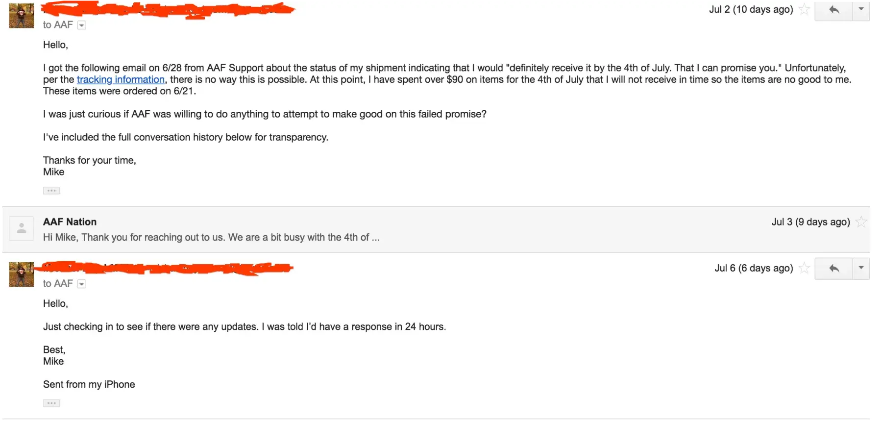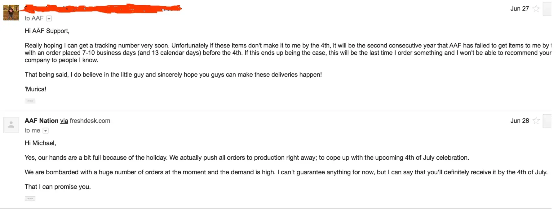 - June 28: I reach out to AAF support as I'm concerned my items won't make it in time (for the 2nd consecutive year). AAF support says, "I can say that you'll definitely receive [your items] by the 4th of July. That I can promise you."