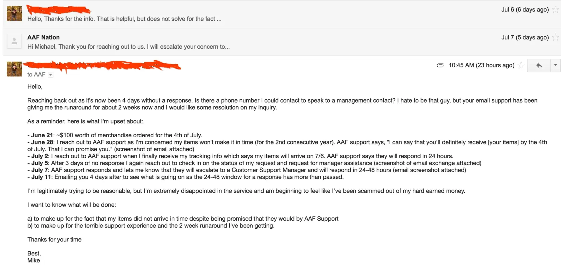 - July 7: AAF support responds and lets me know that they will escalate to a Customer Support Manager and will respond in 24-48 hours
