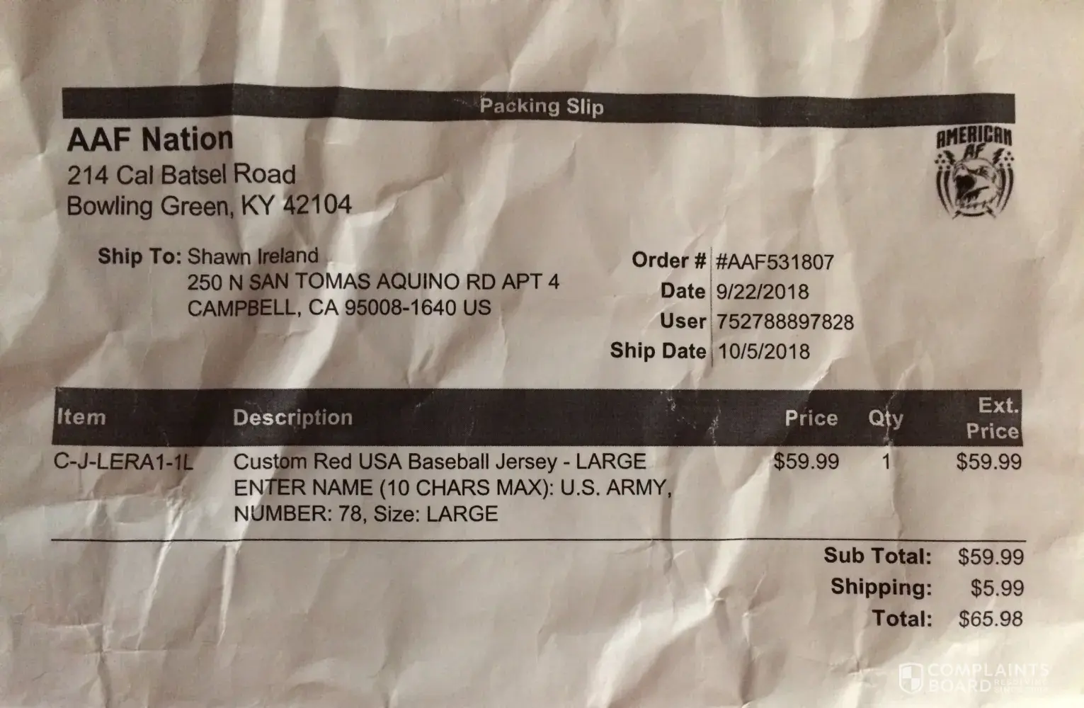 I ordered a custom red USA Baseball Jersey on 9/22/2018, my user number is: [protected], and was shipped 10/5/2018. When I opened the package and looked over the Jersey I noticed that you have made a mistake on the printing on the back. As you can see the package slip shows the spelling on the back to be U.S. ARMY. What is printed is U.SARMY. I made it clear and your package slip shows that I did request for the spelling to be U.S. ARMY. You offer ten letters and I have only used 6 letters, two periods and one space for a total of nine spaces. I have paid $65.98 for a shirt I can't wear as it makes no sense in the back. Please contact me with your actions to correct this. The size was Large. Will be awaiting your reply.