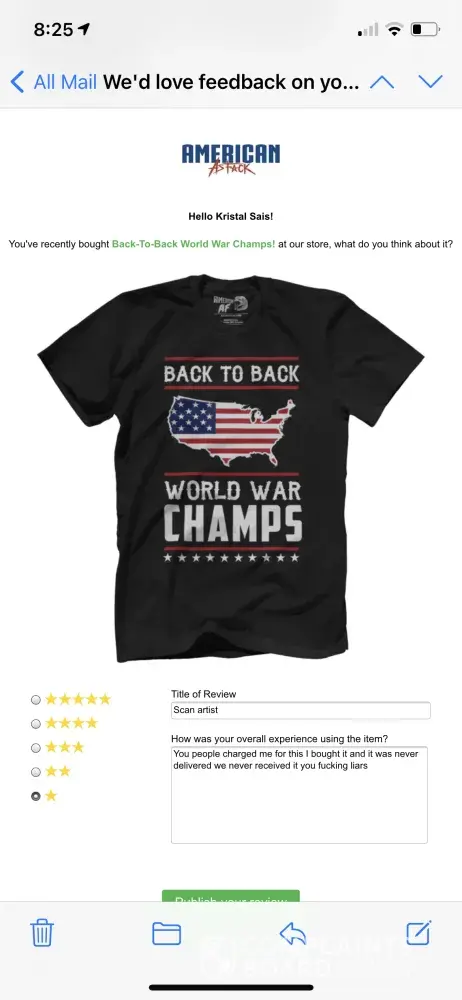 I just don't understand Why they wouldn't deliver the shirt that I paid for… And I almost hope that the owners are not really veterans because I would hope that they wouldn't treat each other this way