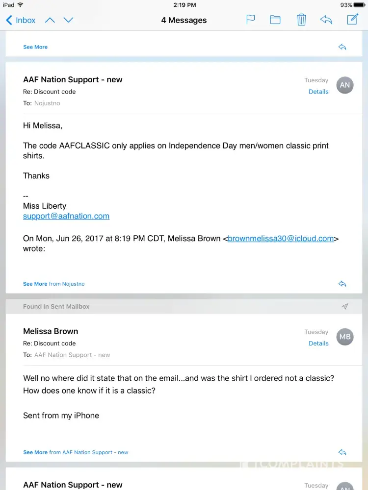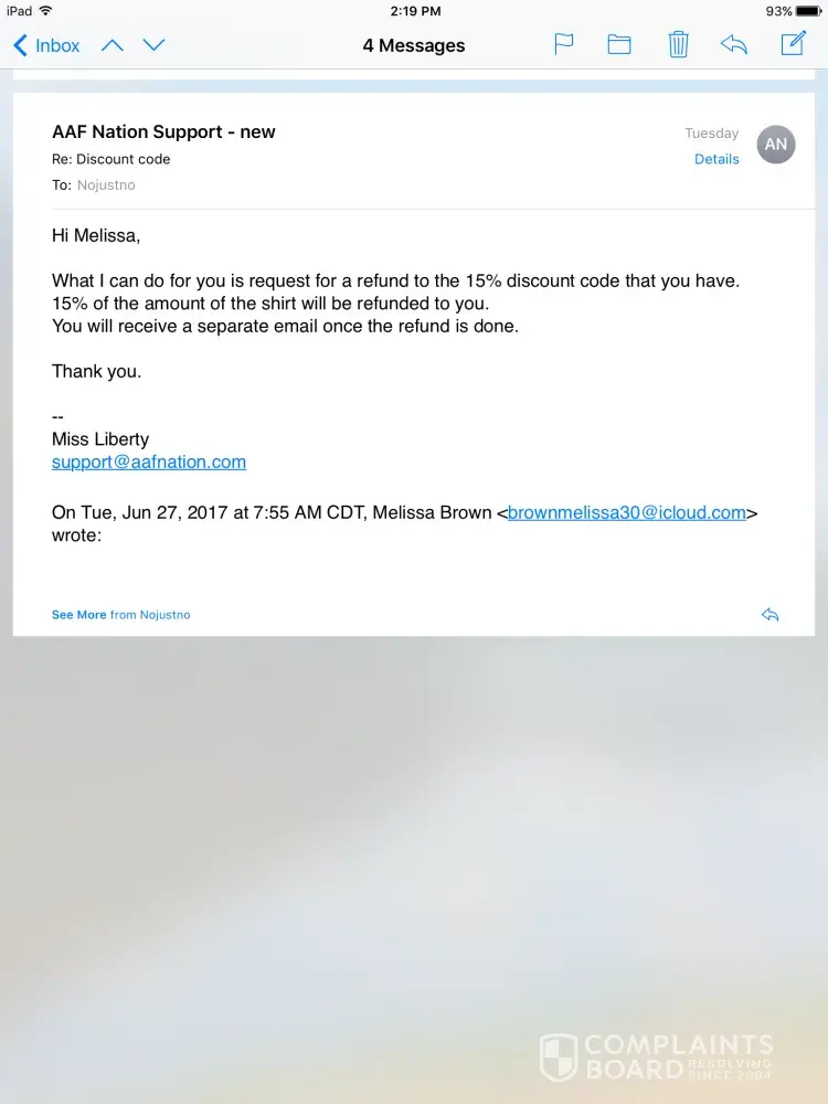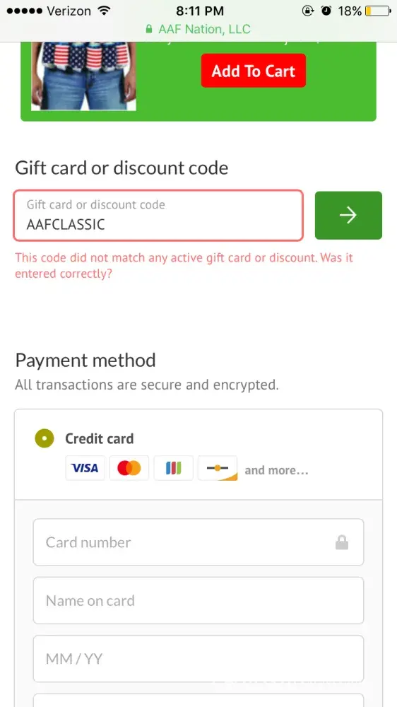 Monday night I check my email and saw AAFNation is having a 15% off promo. One of the shirts shown on the email I loved. Go to website to order it, begin checkout and promo code will not work. Tried upper and lower case. Screenshot it. Decided I would order anyways and contact