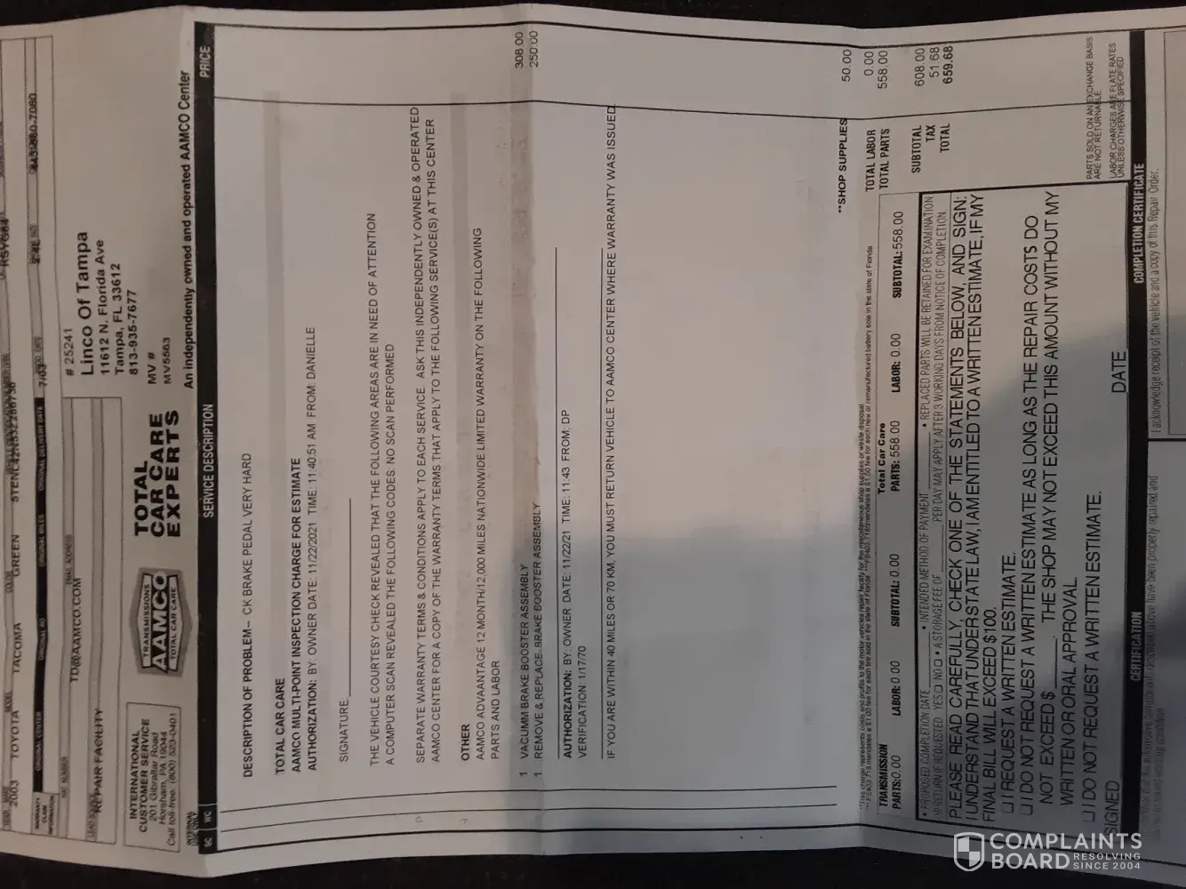 My brakes abruptly required intense pressure to operate. I brought my truck to AAMCO on N. Florida Ave. in Tampa on the morning of 11/22/2021. I was told they required a part to fix the problem and it could take some time. The next afternoon I went to pick up my truck. I was told they had installed a brake booster and that the brakes worked fine now and...