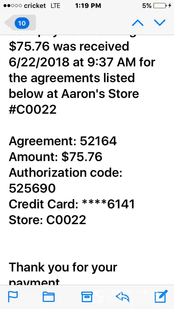 In April, Aaron's charged my debit card twice and then lied about the second charge. Come June, when I called to pay, they tell me they don't have April's payment and since it's june I'm now two months behind. I went in the store in May and paid in cash and was never told about April's alleged missed payment, nor was I contacted in anyway about being allegedly a month behind. They told me it's a problem with my bank, but in black and white you can see a 105 transanction in April and a second false charge in April that was 110 (and disputed). Aaron's claims they never got a payment for April, although there is tangible evidence and the store manger which is who I spoke with told me I am being belligerent and blowing things out of proportion, yet 105 dollars of my money is gone and unaccounted for.
