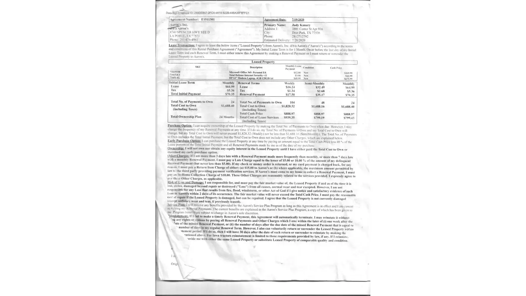 I was charged double almost two years ago for a HP 14" laptop, I will have it paid for July 2022 after paying 24 payments at 70.35 cash total after all payments totals 1688.00. I really didn't pay any attention to the price at the time. I had no credit and was really needing a computer. I guess I can't remember what I thought about the price. Why I am now reporting a problem is a few weeks ago my daughter was needing a computer. I thought I will have this computer paid for in a few months and I can give her this one and I will buy me another new one. I called the manager of the store in Laporte Tx and asked him about another HP laptop he had one but it was a 15". So I asked him how much he told me it would be 12 payments at 70.35 and cash price would be 844.00 when I was done paying all payments. I told him okay and they delivered the computer. It was a HP 15" Laptop. After the computer was delivered for some reason I got to looking at the contract. I thought why is this one cheaper and it is a bigger laptop. I compared contracts and seen I was paying double for the 14" HP so I called the store mgr and asked him why was this computer less than the one two years ago. He told me he was not involved with the sale and I must of agreed on that price. I could not understand his explanation. Why would I want to pay two years verses one year and cheaper. He could not tell me and so I just left it at that. The more I thought about it the more I got mad. I am 70 years old and on a fixed income and paying almost 2000 dollars for a plain HP laptop was ridiculous and I wanted an explanation and I still do. Also I found out on the internet that 2 years ago Progressive Leasing had a class action lawsuit against it and guess who owned Progressive Aaron's did. So maybe that is why I was charged such a high price. I also was charged for Microsoft 365 office of 170 dollars which I was not asked if I wanted it didn't even know I had it on my laptop. Also the security I was charged 42.00 . I also noticed that both contracts are not signed by the sales person they are typed in General manager or manager.