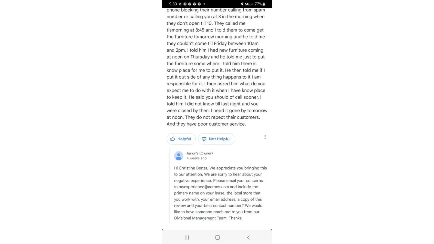 My name is Mellissa Johnson and I have account at the 175 Seagoville Texas Store . I contacted the Aarons store and spoke with the account manager Marci and explained to her that my dining table broke and with the Holidays coming up I needed a dining table. I already had a washer and dryer with them. The delivery driver showed up very late and was out of breath when arrived at my home . I asked him if he needed some water and he had a crappy attitude and stated that no thanks I want to hurry and get this dining table delivered because I need to make other trips to pick up law mower and so on. He acted like I was bothering him and I was in his way. At the time he acted like he did not want to be delivering anything with his sorry attitude. I had a round dining table with four chairs. The delivery driver put the dining table together outside . I just had my previous birthday and my father and husband surprised me with a new scroll screen door for my birthday. When the delivery driver was trying to come through the door he hit my glass and scratched it. He then hit my walls in my entry way and hit my electric fireplace and hit my edges of my walls damaging paint that me and my husband just had professionally painted. He then hit my edge of my walls in the dining room. When he put the pedestal on the top he was in a hurry to leave. When me and my family sat down to dinner the first night the table was so wobbly we could not enjoy our dinner. The table was damaged and was not properly installed in the first place. Then the following next day I contacted the store and spoke with Joe the store manger regarding about the damages that was done on our home by his delivery driver . I was told by Joe that I would be contacted by the corporate office and they will be sending me a check for the total damages on our home and weeks went by no phone calls or nothing. I contacted the store and spoke with Shannon and she states when I am asking her for Joe boss name that she spoke to me on the phone like this I am going to stop you there you need to speak with Joe not me and I was like that's [censored] cause nobody ever calls anybody back and I ant to know when I will be contacted by the corporate office regarding my money you guys owe me for the damages on my home . Then I filed a complaint with Aarons Corporate office and they state that I will be contacted by the Regional Manager and well after a week I was finally contacted by Karl. I explained to him about the situation and that I want to know where our money was for the damages on our home and he stated that Joe the manager should of been trained and explained that Aarons Corporate office has a company that comes out and fixes damages and repairs. I am thinking really this happens to a lot of customers it seems. I was promised that I would be taken care of and well here it is three weeks now and even the Regional Manager does not say what he means either . I will never rent or refer anybody else to Aarons . They do their customers wrong treat and talk to them and damage their homes and well delivery driver was wrote up really he should of been terminated and he should of had to pay out of his pocket damages to my home. Aarons is a joke .