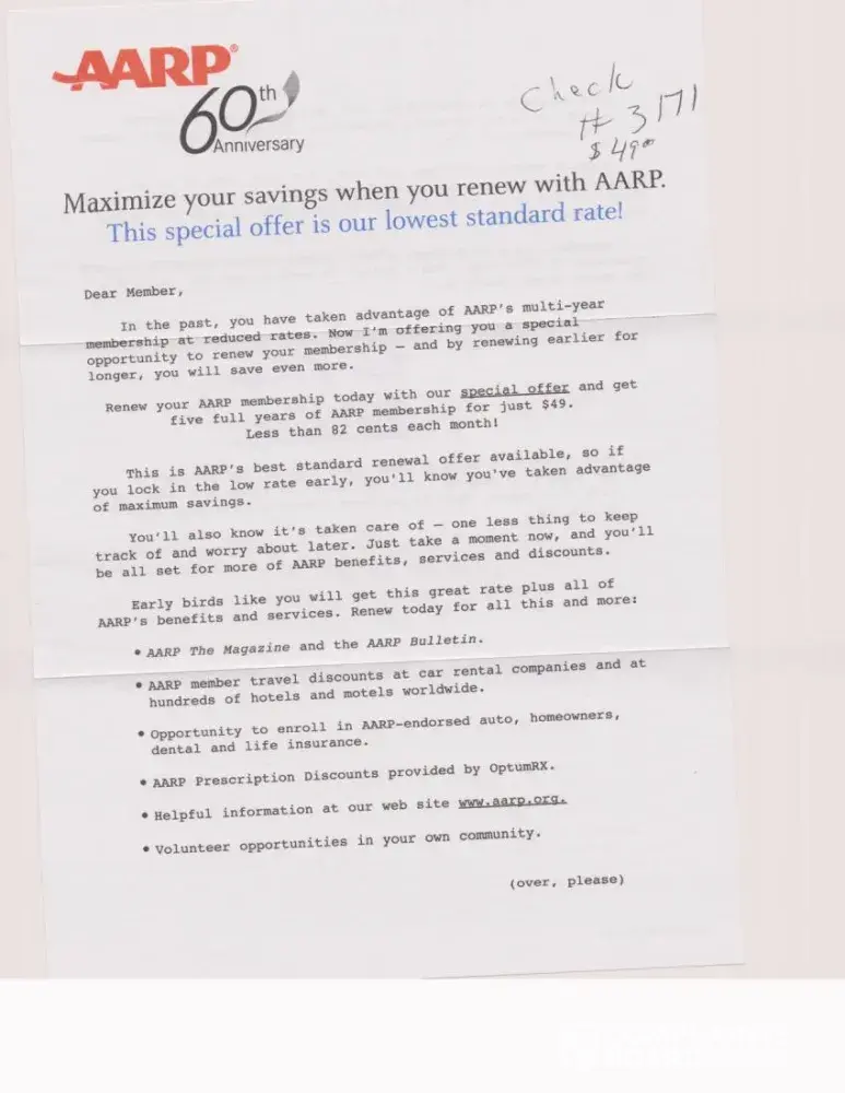 I received an AARP renewal 5 years for $49.00 mailed to AARP P.O. Box 93125 Long Beach CA [protected]. Is this a legitimate renewal or is someone trying to rip me off? If I were to renew on line it would cost $63.00. If it is legitimate, why is the $49 reflected on AARP.org website? There were no renewal "specials" that I could find on the aarp.org website. Does AARP and its affiliates share my address or any other of my information to anyone?