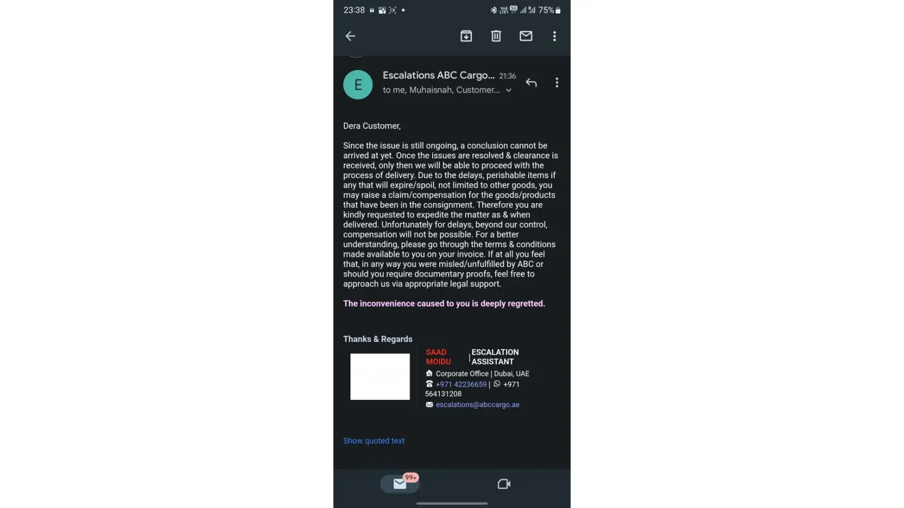 Make sure the cargo reach asap else we need to file a case against the company in UAE consumer protection court!