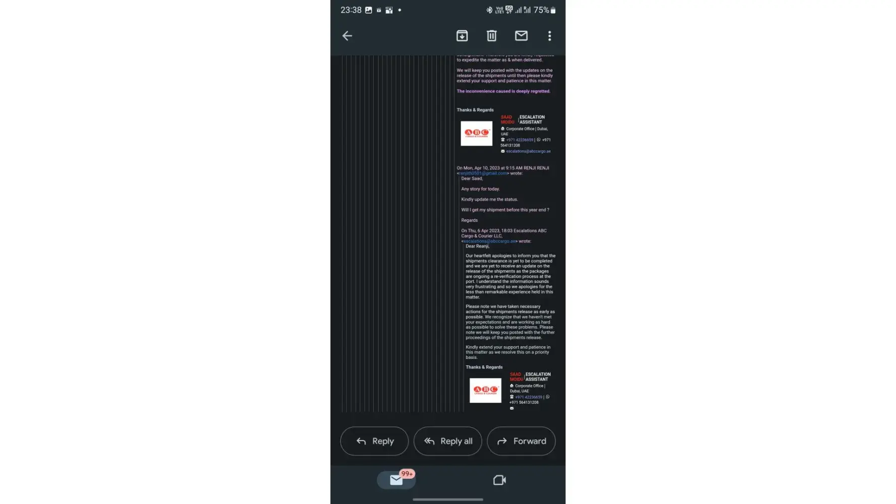 Hi i had sent the cargo on June 26 as per you terms and conditions it should reach in 40 days or 45 days now it's 57days when you are promise to the coustomer you have to hold that but you are giving only wrong info were i can see the comment below. When i tried reaching your agents there is no proper replay. nd your CC service they will say to send email I really don't know that what is the use of it sending email 📨