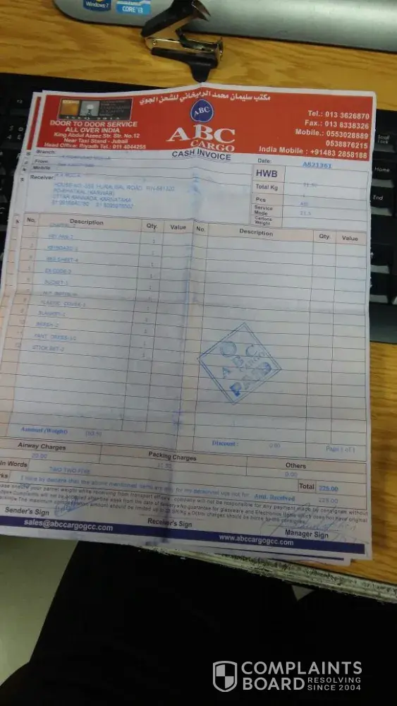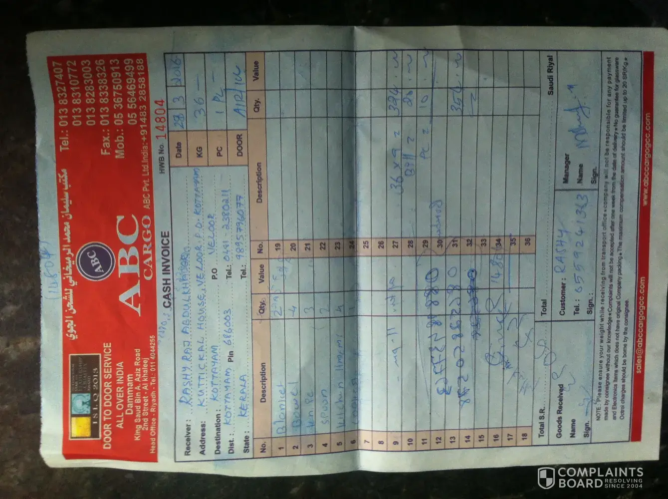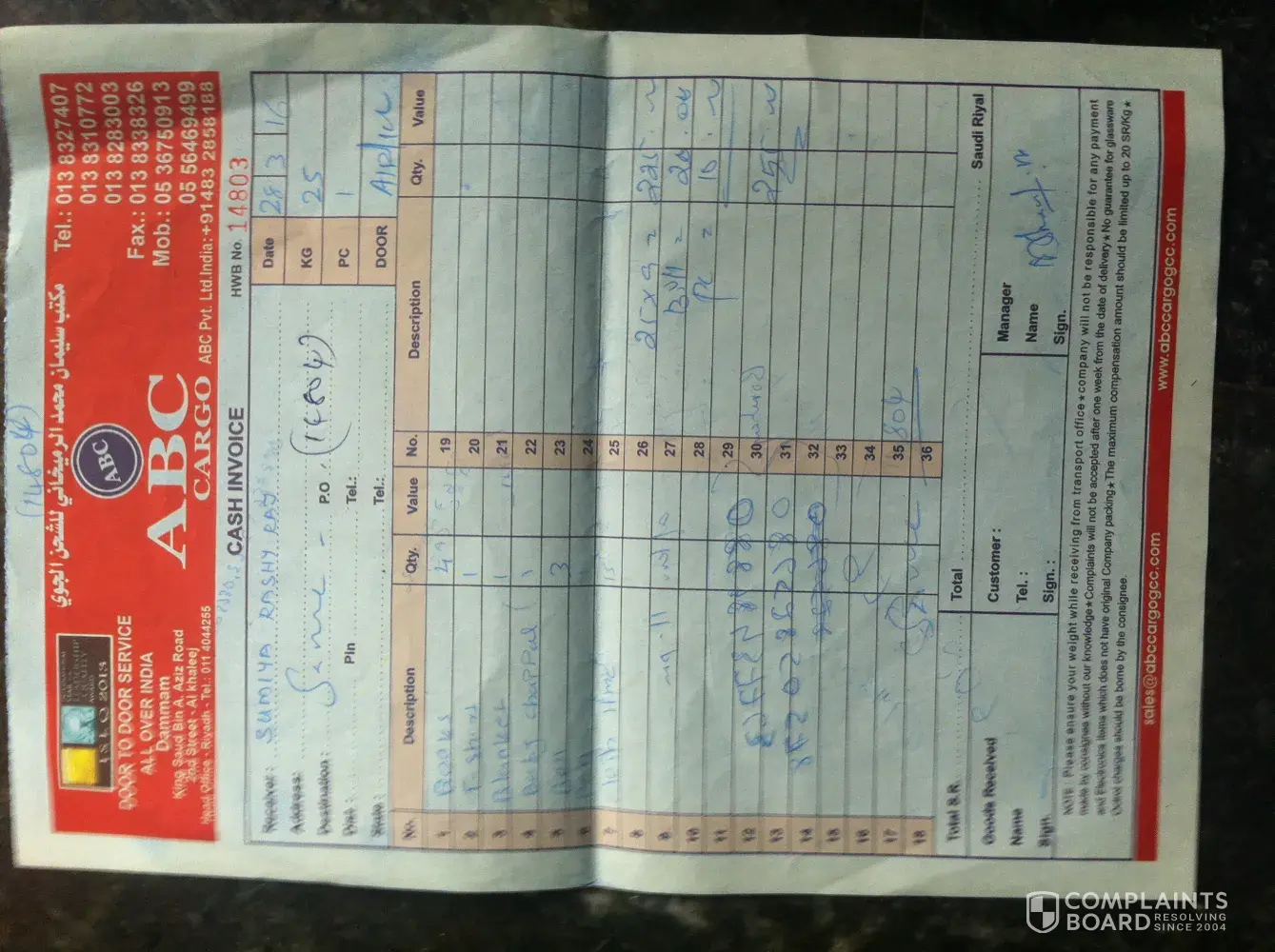 My self shakilur rahman despatched 13 boxes cargo through abc cargo al jubail k.s.a to new delhi in the month of june 2015 in 3 trips. already 16 months have passed but still i did not received a single box. details as follows.