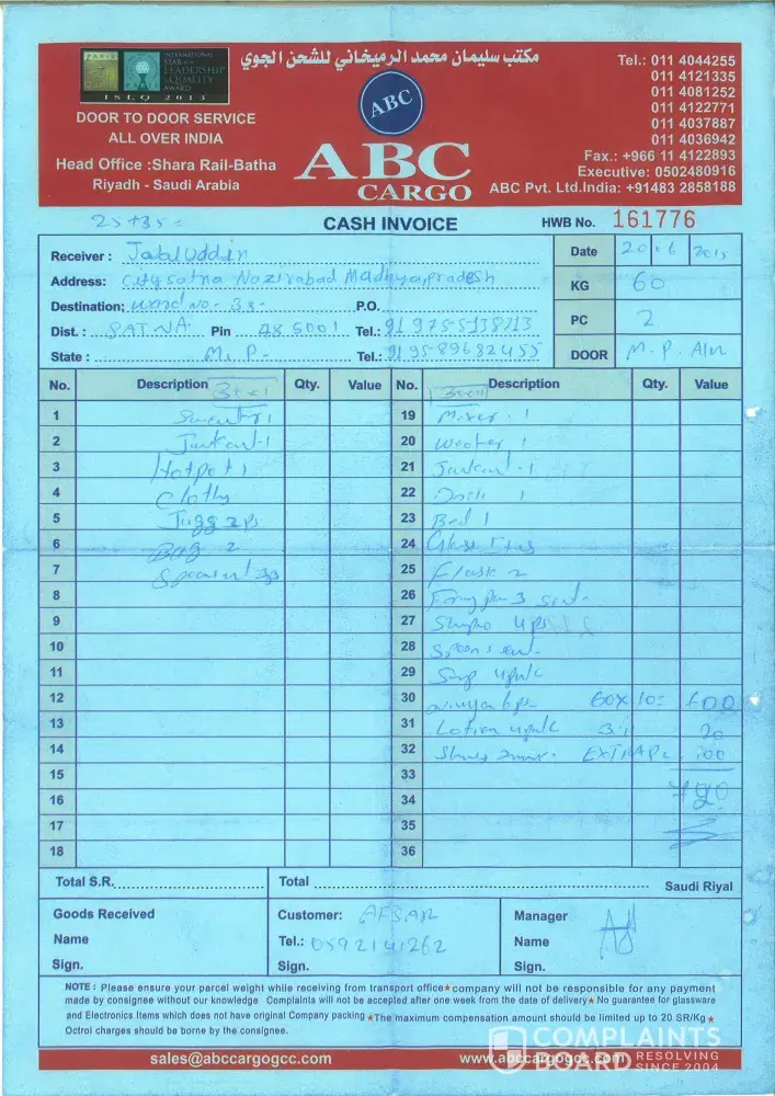 I had send total 2 boxes of 30/30kg. through ABC Cargo, from BATHA branch AL RIYADH to INDIA (Madhya Pradesh : city satna) in the month of 20 JUNE 2015, on dates, details are given below.