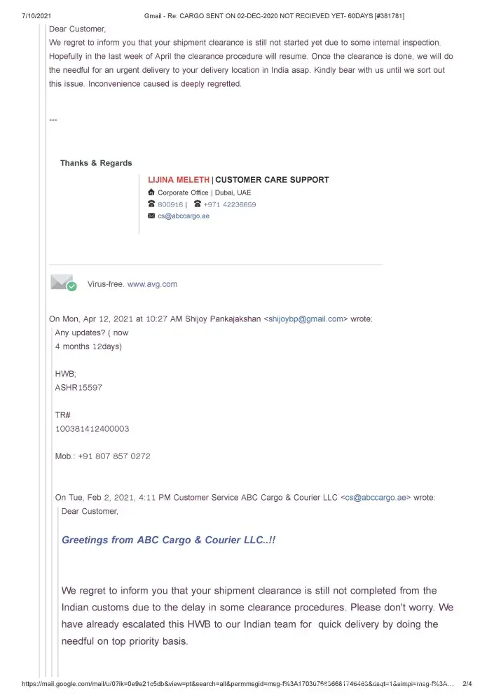 AFJT80937 - ABC Cargo poor customer service - 4 Months my consignment haven't reached to India