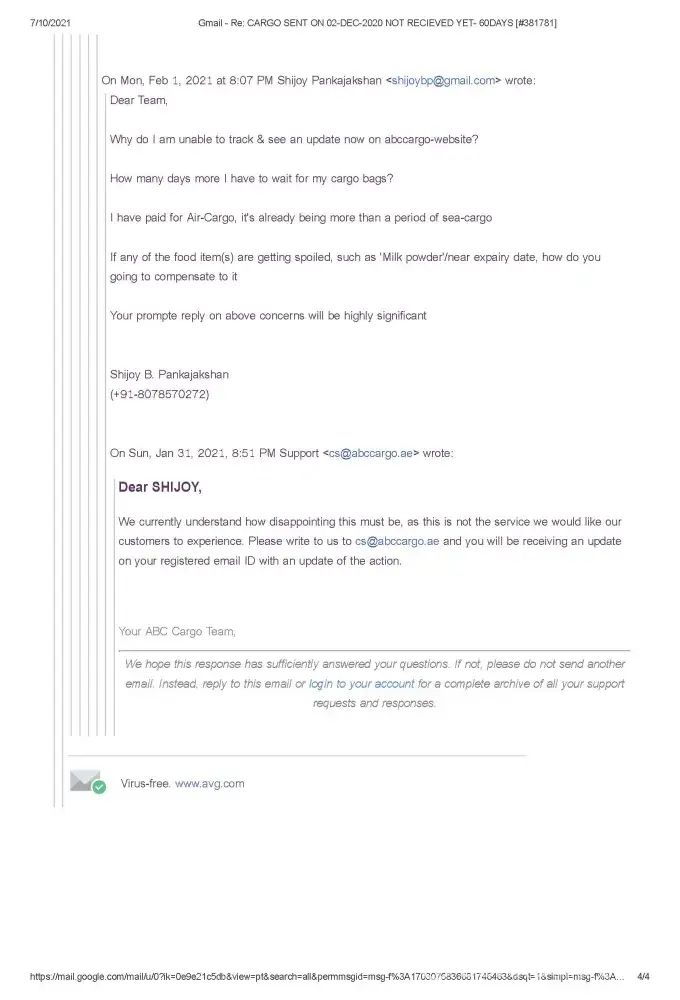 The recent reply from ABC Cargo customer service is as below (Let us watch if this happens or not);