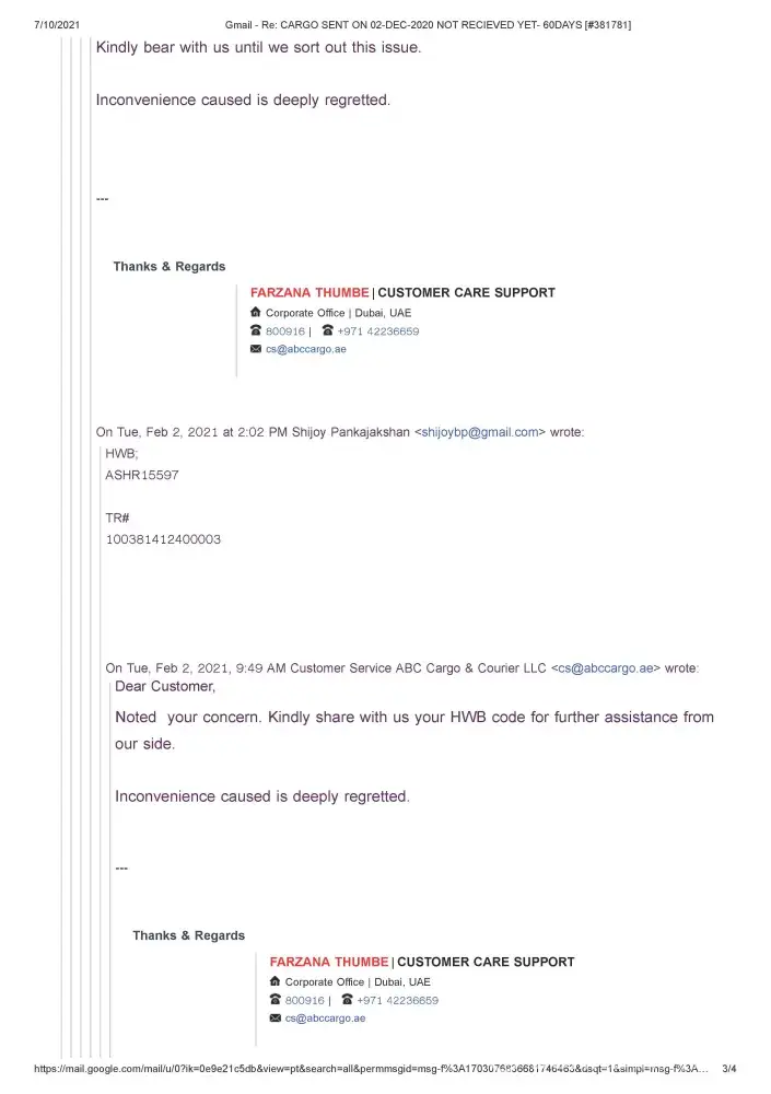 I am having a terrible experience with ABC cargo, i sent my parcel(50kgs) on 02nd Dec 21 from Fujairah UAE but till date i haven't received the parcel in my home(India) it was suppose to reach in 20 days.