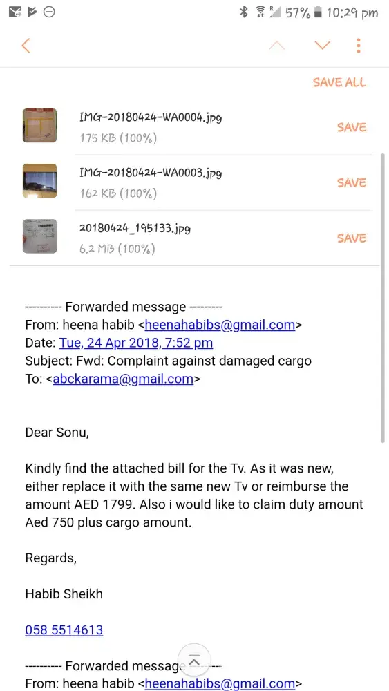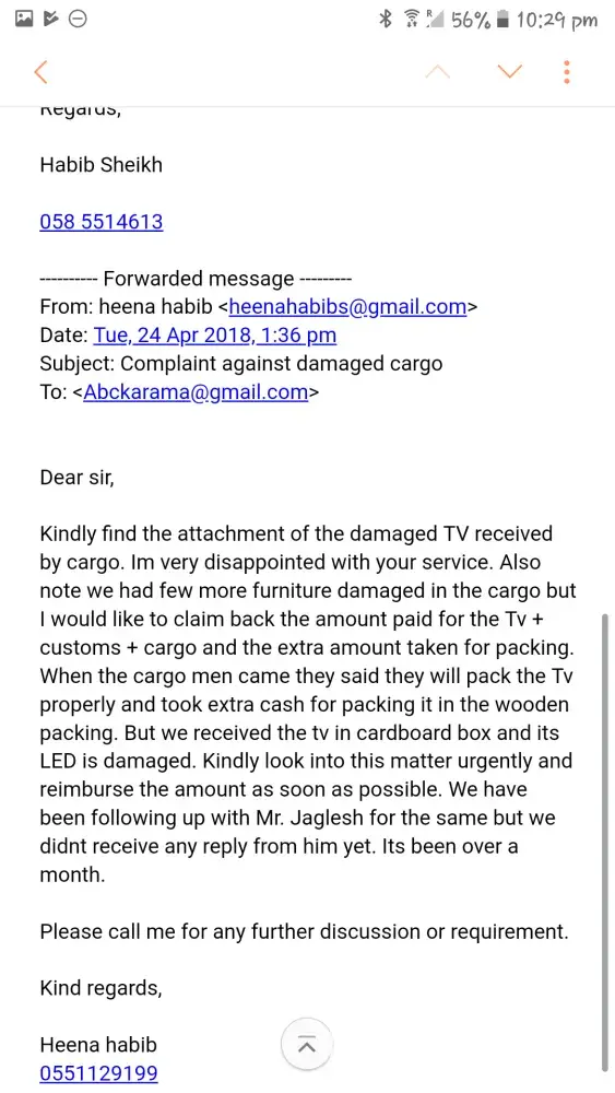 As discussed with Mr. Zubair (971 [protected]) he told me that you will receive within 48 hours. As 48 hours has been passed, on 28th 2018 September I called him back and asked for the update. Now he is saying it will take 5 to 6 days. Mr. Zubair tried to shallow attempt my question which I don't expect from a service provider. I couldn't get any satisfactory response response either by call or mail from ABC cargo. The question raise to management team why there is lack of proper communication. The strict and necessary action need to be taken from management team. I am hoping to look into this matter on high priority and your satisfactory response still awaiting. Thank you