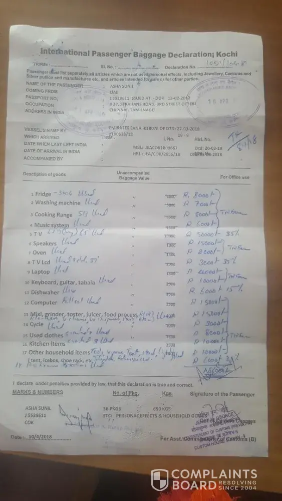 We booked Sea Cargo to Chennai and paid AED 4000/- for 36 Boxes. Mr. Basha who took the booking informed that it will be door to door delivery and we need to pay only Customs duty in Cochin Airport. When we asked why in Cochin he informed they will deliver items to Chennai since it is door to door and need not worry other than Customs duty charges.