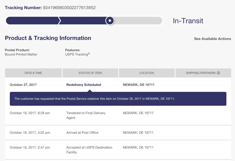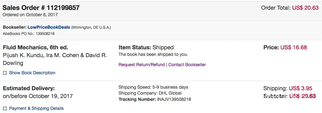I placed an order on 6 October and the order number is [protected]. However, I still did not receive the book 12 days after the estimated delivery date (19 October 2017). I tried to contact the bookseller for twice but failed. I also asked usps about my package and they said they did not know where the package was. I really need the textbook right now and this has wasted too much time and energy.