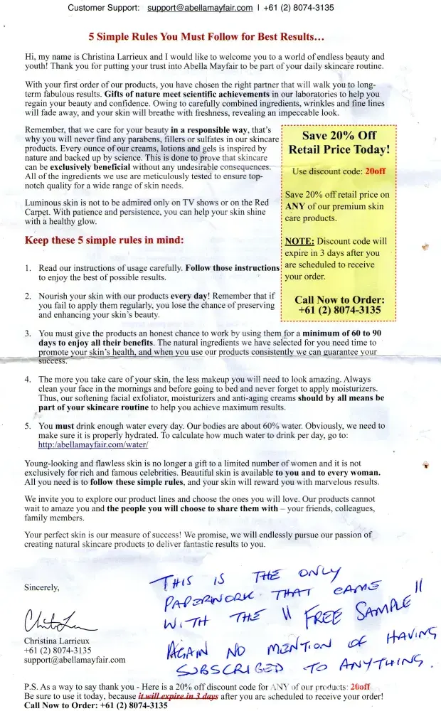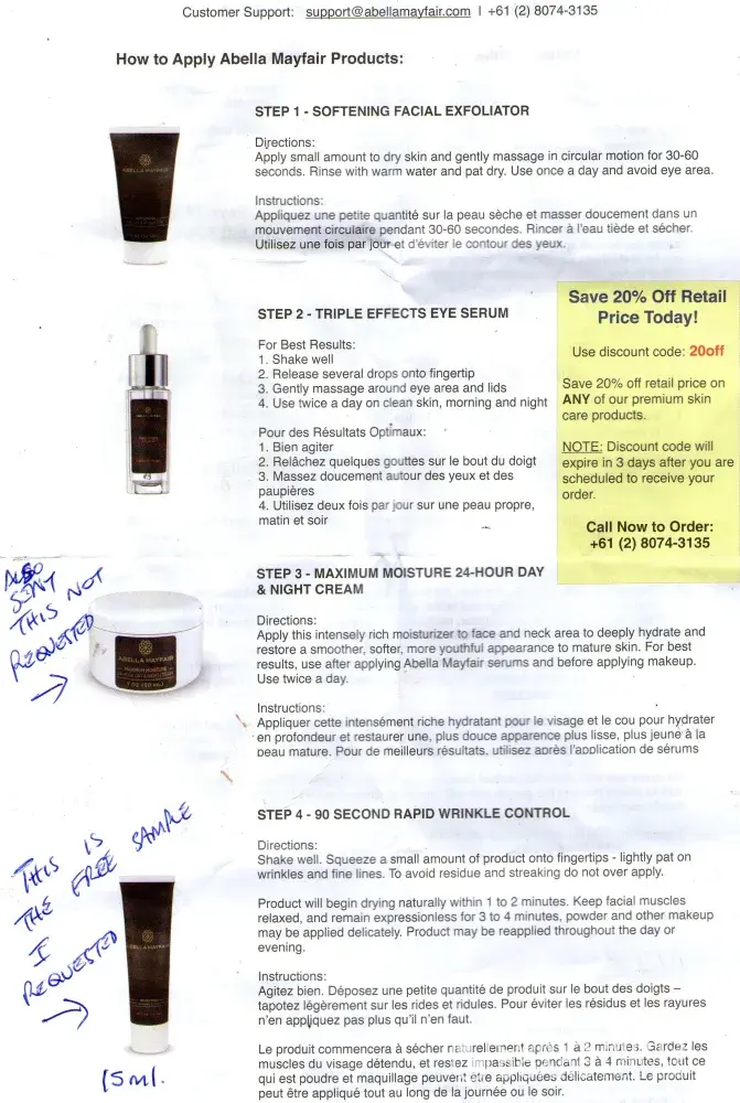 Regarding the abella mayfair cream, I only received the first trail and after that I did not received any more but you guys keep charging me for it without my knowledge. I noticed that you charged me twice. When someone offer a free trail means that the first sample is free at no cost.